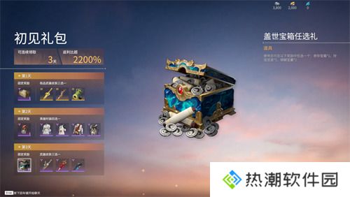 1、初见礼包售价12元,能够连续三天领取极品皮肤和各种道具。2、第一天可以自选三个武器极品皮肤,推荐选择长枪或长剑金皮,火炮金皮可以放弃。