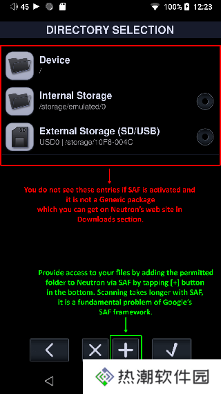 2、如果您在Android 11+上使用2.19+ 版本,那么您将看不到 Device 或 SD,只能访问 Neutron 的内部文件系统(沙盒)。您可以通过在网络设置中激活内部 FTP 服务器来访问它。点击底部的[+]以添加允许 Neutron 访问的文件夹。